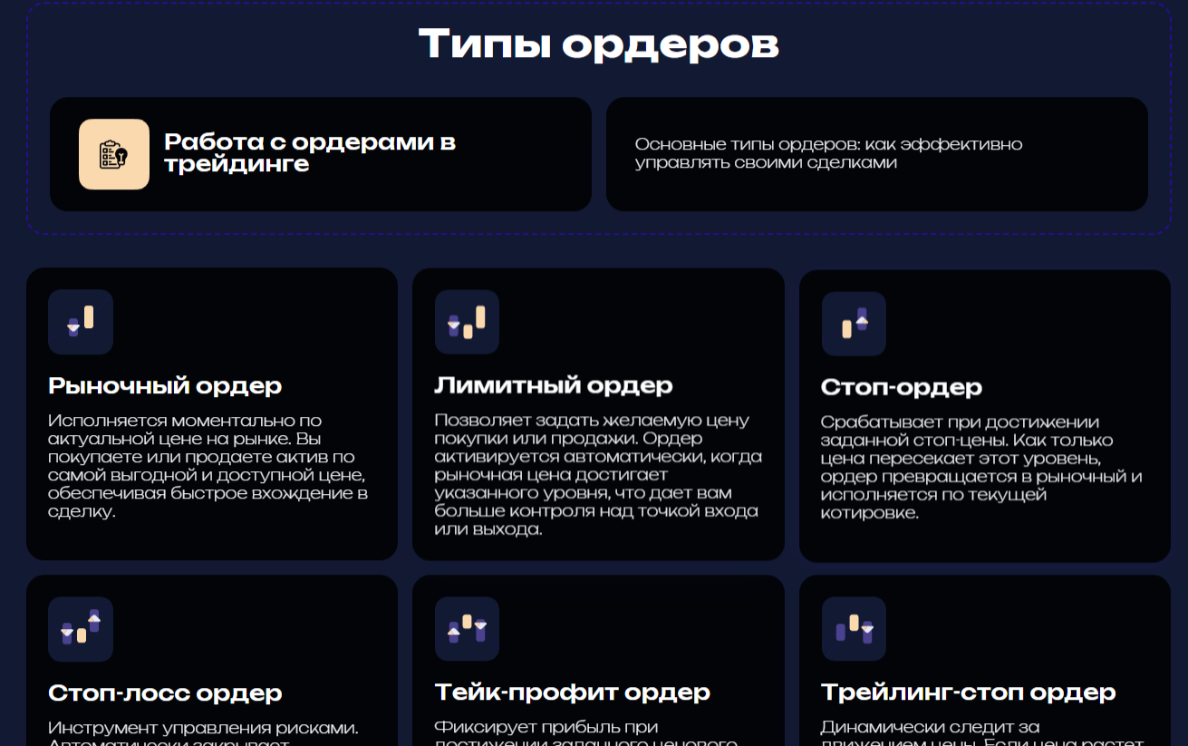 Брокерская организация предоставляет всем желающим возможность торговать на уникальной платформе с интуитивно понятным интерфейсом и высокой скоростью обработки сделок. К услугам трейдеров несколько типов ордеров: Market Order, Limit Order, Stop order, Stop loss order, Take profit order, Trailing stop order. Получать прибыль от трейдинга можно на операциях с рядом активов: