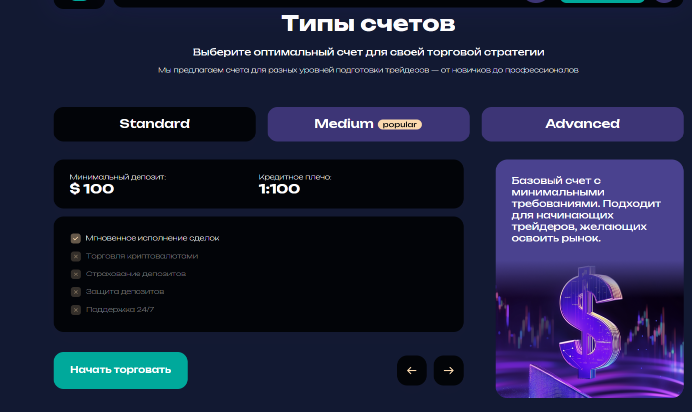 - Standard. Депозит от 100 USD, леверидж 1:100.