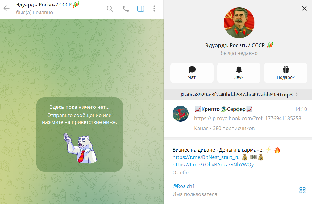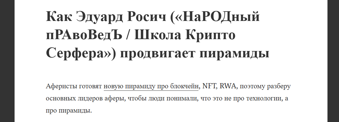 По открытым данным в интернет-источниках видно, что Эдуард Росич – это инвестор, ведущий несколько взаимосвязанных площадок в Сети. Его основной аккаунт в Телеграмм – @Rosich1, где он сам подписывается как «Эдуардъ Росiчъ / СССР». На Ютубе у него работает канал «НаРОДный пРАвоВедЪ», который изначально позиционировался как правовая консультация для обычных людей, а со временем переключился на тему криптовалют, инвестиций и командного заработка.
