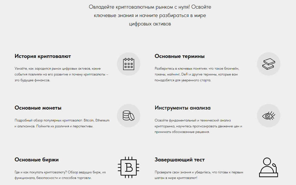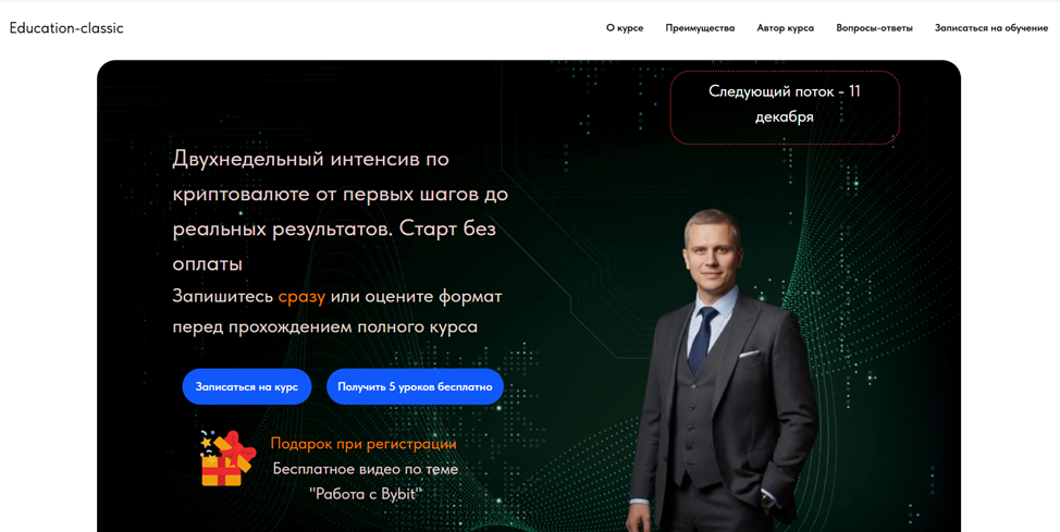 Разработчики Education Classic Ru утверждают, что их курсы созданы для новичков в мире криптовалют и готовы дать всем базовые сведения совершенно бесплатно. Эксперты на только предоставят видеоуроки, которые можно просматривать в удобное время, но и будут две недели круглосуточно отвечать на вопросы. По завершении всем слушателям обещают выдать сертификат. Предложение весьма заманчивое, но подробная информация о пяти презентованных модулях отсутствует. Есть большая вероятность, что далее предложат купить полный курс сомнительной эффективности за серьезную сумму.