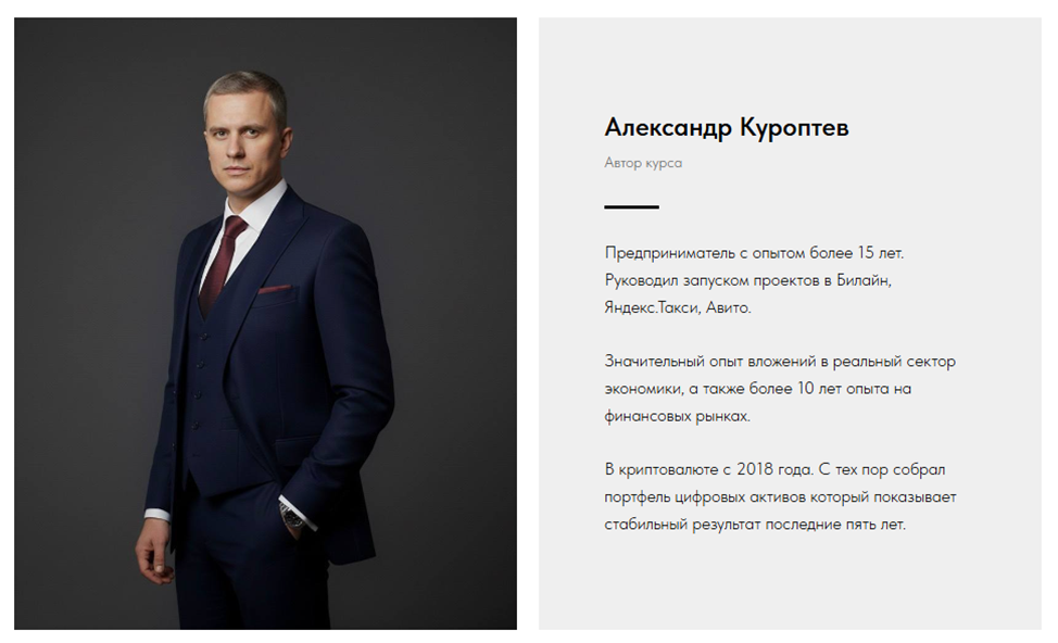 По данным сайта автор курса Александр Куроптев имеет пятнадцатилетний опыт предпринимательства, руководил запуском всем известных интернет-площадок Билайн, Яндекс.Такси, Авито и уже 10 лет инвестирует средства в экономику и криптовалюты. Вот только эта история с одинаковой фотографией кочует с одного сайта на другой даже без малейших изменений. Среди таких ресурсов легко найти turcanschool.com, education-grow.ru и другие.