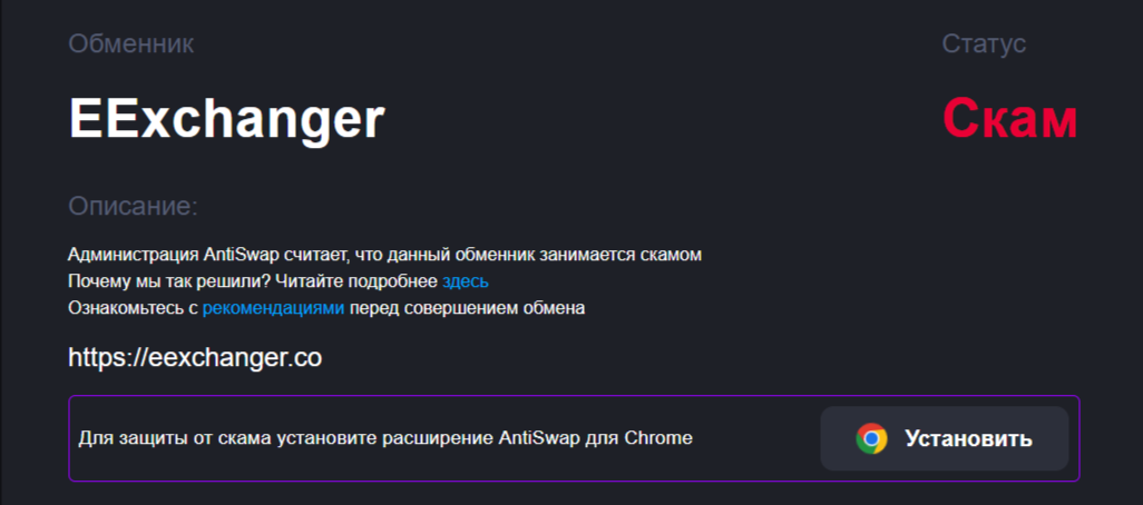 EExchanger – очередной псевдообменник без лицензии и юридического статуса. Задержки в обработке заявок, отсутствие гарантий и непрозрачность работы делают его идеальным местом для потери ваших средств. Неудивительно, что эксперты уже окрестили его скамом. ([ ](