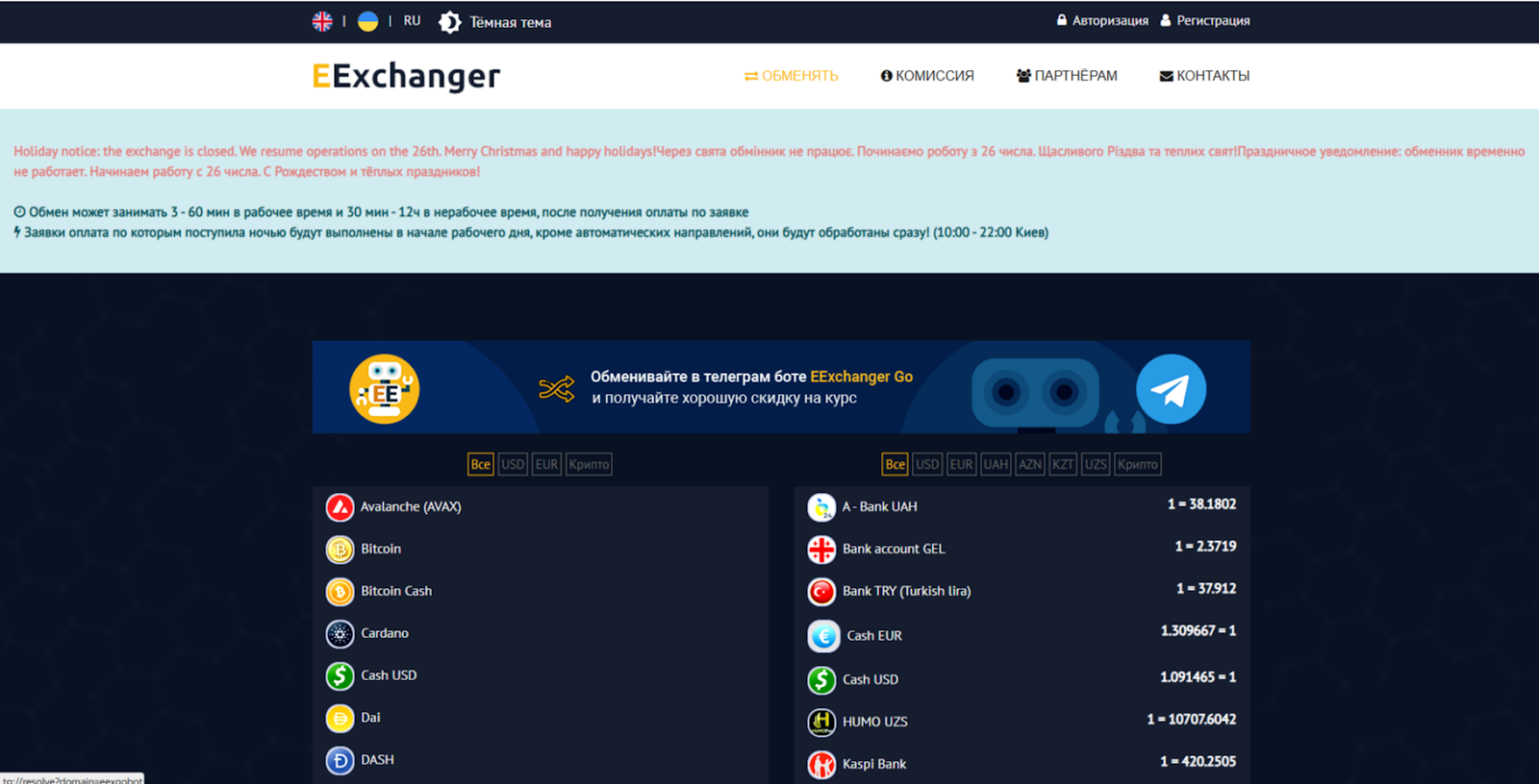 Криптовалютный обменник «ЕЕксченджер» нашей командой не рекомендован к сотрудничеству. Партнерские отношения с этим сервисом могут привести к крупным убыткам. Для осуществления выгодного и быстрого обмена выбирайте надежные площадки из наших обзоров.