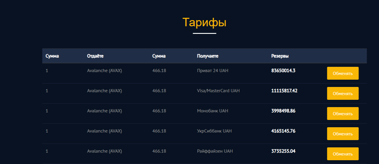 На протяжении всего своего существования обменный пункт занимается транзакциями с фиатом и криптой. На платформе EExchanger пользователи могут обменять ETH, TON, LTC, BTC, SOL и т. д. Всего здесь обмениваются 30+ цифровых активов. Для обменных операций клиенты сервиса могут использовать UAH, AZN, USD, EUR, KZT, UZS. Совершать обмен можно посредством ряда платежных сервисов: