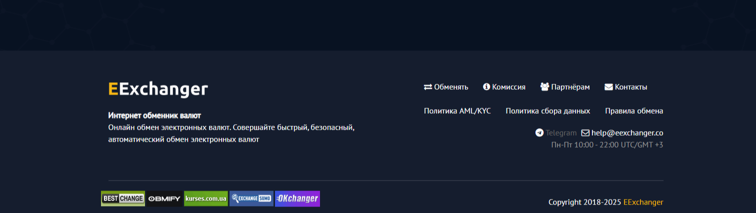 Услугами криптовалютного обменника EExchanger все желающие могут воспользоваться с понедельника по пятницу с 10:00 до 22:00 по Киеву. Этого же режима работы придерживается служба поддержки сервиса. Связаться с нею можно в письме на электронную почту help eexchanger co или посредством телеграм-канала EExchangerHelp Online Chat (EExchangerHelpOnlineChat bot).