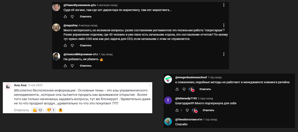Отклики о работе специалиста и ее академии мы искали на сторонних сайтах и ее ресурсах. На независимых площадках пользователи не пишут положительные комментарии, не благодарят проект Медниковой и не подтверждают, что после того, как прошли курсы, нарастили доходы. Отрицательных откликов о разводе тоже там нет, но вот противоречивые комментарии встречаются на ютуб-канале девушки. Выпускники охотно оставляют отзывы о роликах бизнес-тренера Екатерины Медниковой, говоря, что в большинстве уроков она льет воду.