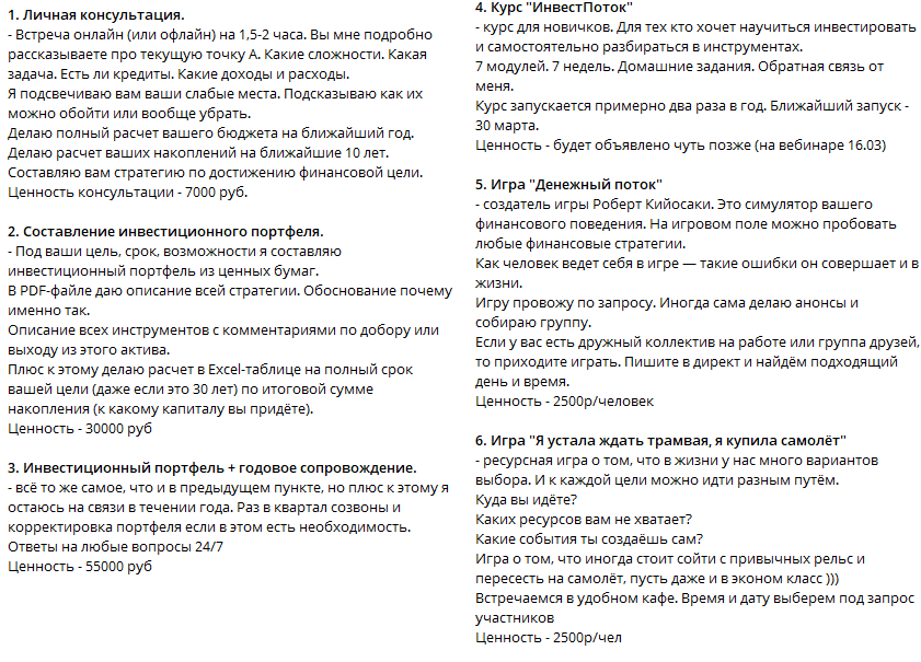 Платные услуги от автора включают в себя личные консультации, составление портфеля, персональное сопровождение и финансовые игры. Стоимость курсов начинается от 3 тысяч рублей, Екатерина предлагает программы по разным направлениям, в том числе и по крипте. Стоимость персональной консультации составляет 7 тысяч рублей, а услуги по составлению портфеля – от 30 тысяч рублей.