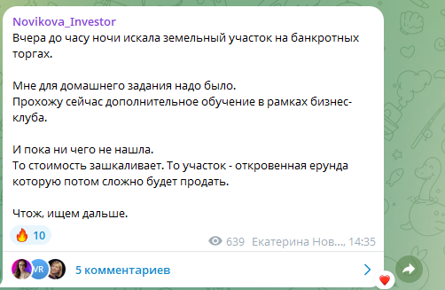 Екатерина периодически делится успехами, связанными с покупкой земельных участков. Но подтверждений доходности стратегий нет.