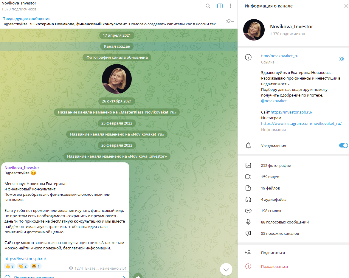 Основной социальной сетью Новиковой является Тг-канал Novikova_Investor (novikovaket ru). На него подписано 1370 пользователей с хорошей активностью, поэтому вероятность накрутки крайне низкая.