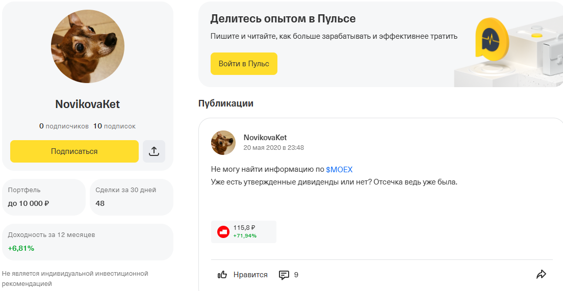 В то же время сведений об инвестиционном портфеле Екатерина не приводит. Стоит отметить, что девушка использует ник Novikovaket. Пользователя с точно таким же ником мы нашли на платформе Пульс. Если данный аккаунт действительно принадлежит Новиковой, то становится ясно, почему она им не делится. Доходность портфеля, конечно, есть, однако она даже значительно ниже ставки по вкладам. Размер портфеля до 10 тысяч рублей. Поэтому работать с Екатериной на платных условиях может быть попросту невыгодно.
