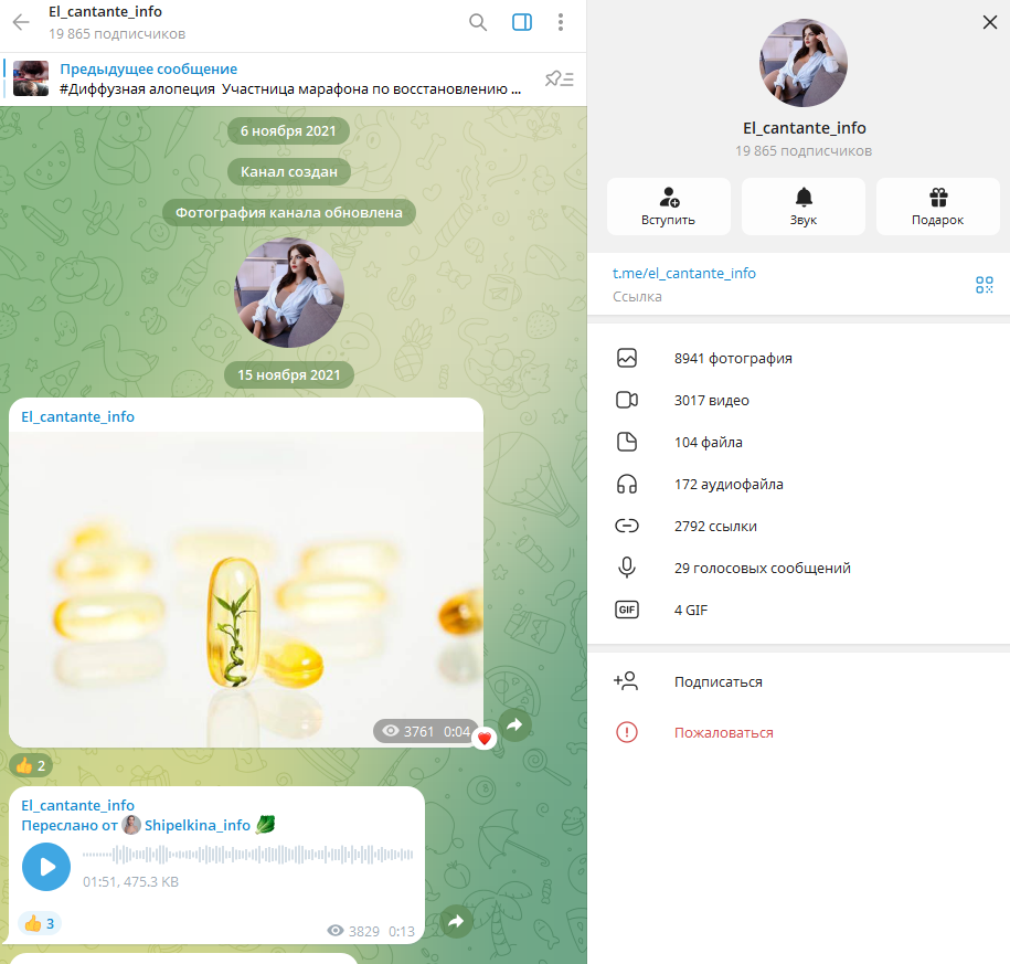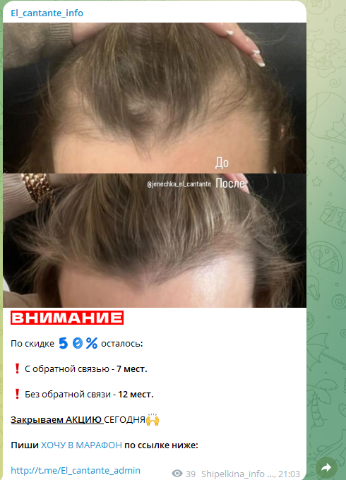 El cantante info – Телеграм-канал, на котором пользователям предлагаются рекомендации по уходу за волосами и кожей головы. Дополнительно автор проводит марафоны, в рамках которых участники борются с алопецией – потерей волос. Отзывы El cantante info канал в Тг получил преимущественно положительные. Мы провели проверку проекта чтобы узнать, насколько безопасно с ним работать.