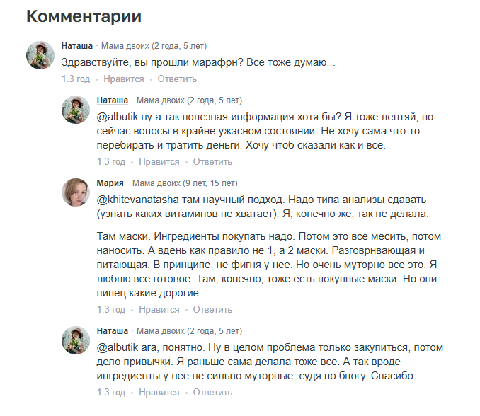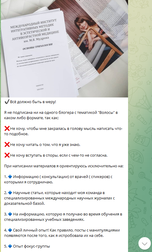 Основной продукт, предлагаемый автором – это участие в марафонах. К марафонам подключаются и другие специалисты – эндокринологи, нутрициологи. Пользователям предлагаются комплексные разборы и рекомендации, позволяющие улучшить качество волос, ускорить рост, предотвратить выпадение и замедлить процессы появления седины. Хотя пользователей и заманивают скидками, стоимость в открытом доступе не указывается. Это может быть негативным фактором, ведь в личном общении могут быть навязаны заведомо невыгодные для клиента условия.