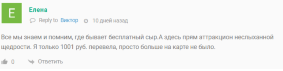 Пользователи отзываются о профиле Елены в отрицательном ключе. Один из них говорит, что перевел ₽1,001, так как на карте больше не было. Он не рассказывает про результат, но пишет о том, что бесплатный сыр бывает только в мышеловке.