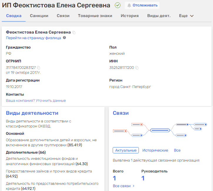 На сайте конторы указывался номер ИНН, и по нему в реестре нашлось ИП Елены. Она зарегистрирована с 2017 года. Основной вид деятельности связан с дополнительным образованием, а остальные – с инвестициями и займами.
