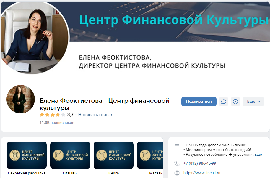 В вк-группе расписывается почти то же самое. Известно, что ее центр инвестиции «Финкульт» работает с 2005 года. Он помогает студентам становиться грамотными в плане финансов. Заметим, что на тг-блог подписано 900 человек, а на в ВК – 11 тысяч. Причем рейтинг паблика составляет всего 3,7, что довольно мало.