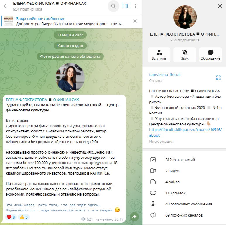 Елена ведет активную медийную жизнь. С 2022 года она управляет телеграм-каналом и сообществом в ВК. В Телеграмм в первом сообщении девушка сразу рассказала, что является директором центра финансовой культуры «Финкульт», более 18-ти лет работает как юрист и как финансовый консультант. Также Елена Феоктистова занимается инвестициями и пишет об этом книги.