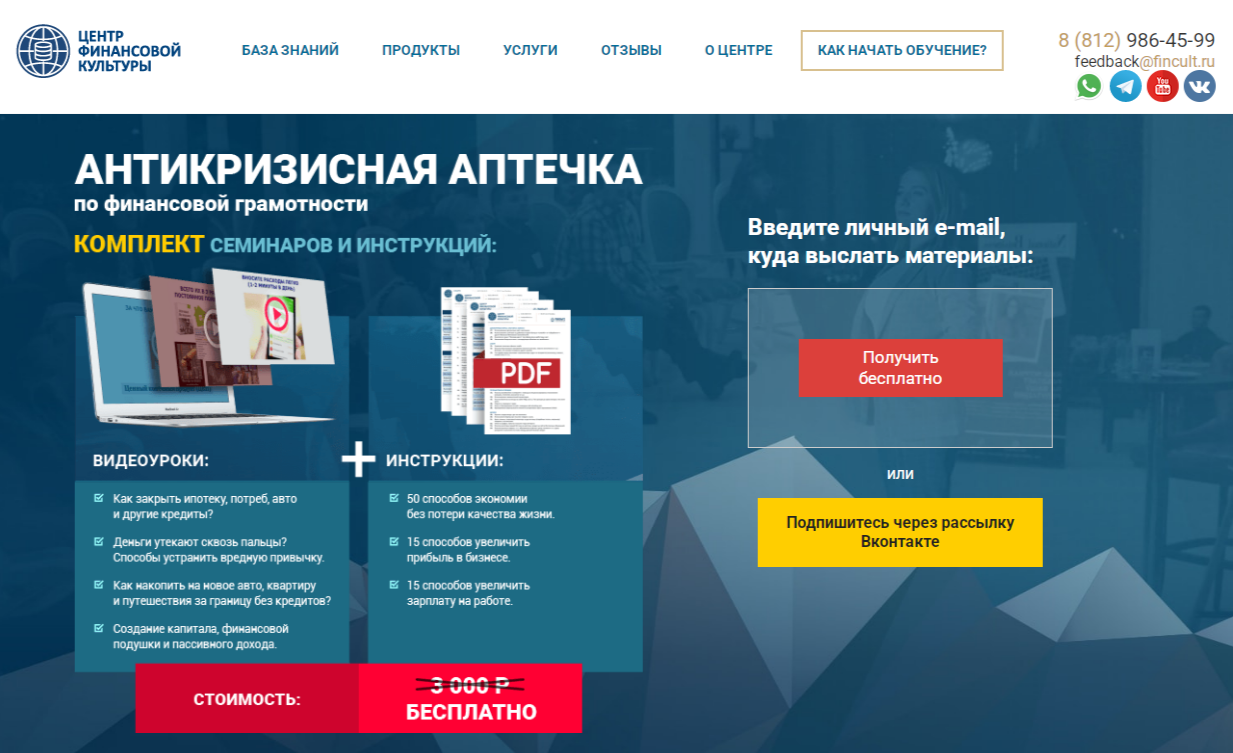 На официальном сайте центра финансовой культуры Fincult Ru, директором которого является Елена Феоктистова, посетителям сразу предлагают бесплатно получить комплект семинаров и инструкции, который ранее стоил 3 000 рублей.