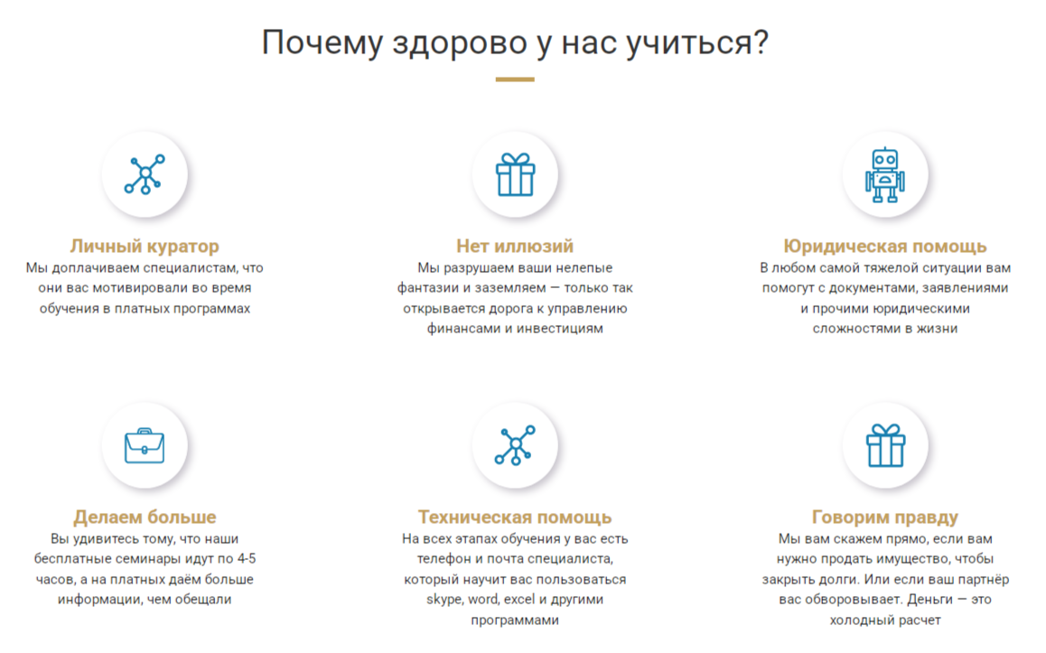 Всем ученикам обещают, что они смогут научиться управлять деньгами, копить без кредитов, инвестировать и создавать пассивный доход, путешествовать несколько раз в год и быть разумными потребителями.