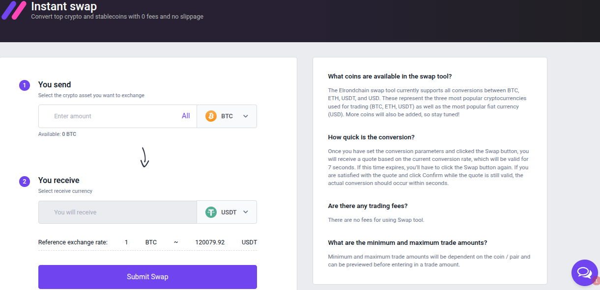Однако основные инструменты ElrondChain com открыты даже для тех, у кого нет верификации. Модуль спотовой торговли можно запускать сразу без KYC, но стоит отметить, что пополнить счет без верификации не получится. Помимо данной фичи, трейдеры могут использовать блок кроссчейн-свапа. Набор активов стандартный — более 50 вариаций криптовалют. Комиссию можно узнать в процессе обмена.