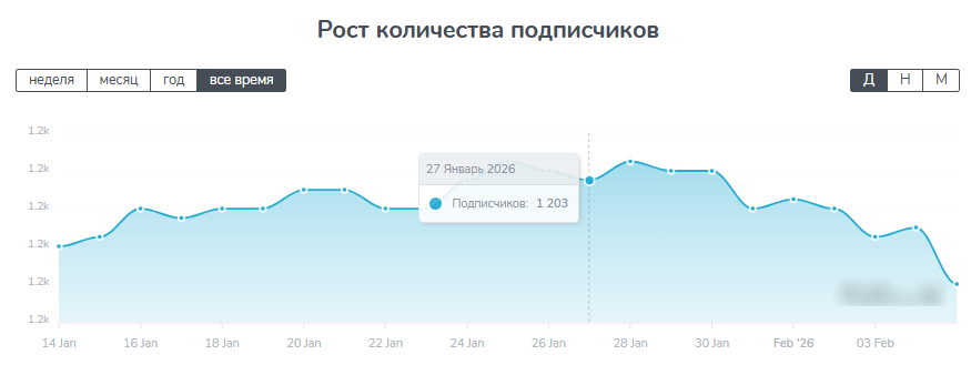 Из-за манипуляций Элины отследить статистику проекта @elina_pro_trading с момента создания не получится, так как данные есть только за 2026 год. Накрутка тут вряд ли использовалась, поскольку динамика ровная, а подписчиков немного.