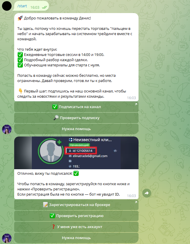 На канале «Эля ПРО Трейдинг» в качестве основного контакта указан бот @elya_ne_bot, куда можно написать сообщение, и трейдер на него ответит. Также у Элины есть приложение @elina_team_bot, через которое якобы можно вступить в ее команду, чтобы покупать и продавать активы по готовым сигналам.