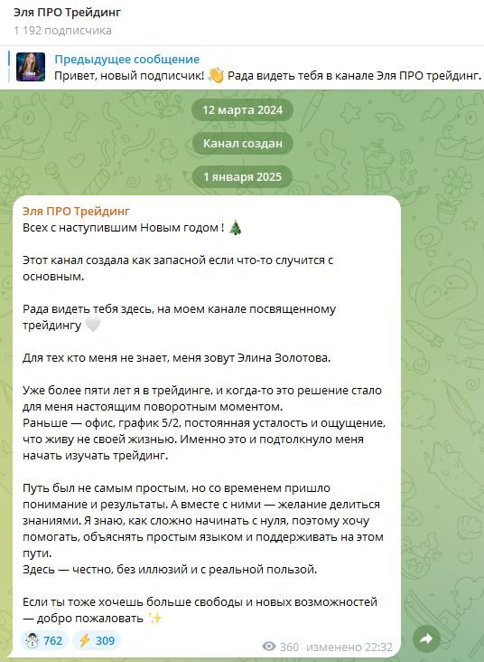 Формально телеграмм-канал «Эля ПРО Трейдинг» существует с марта 2024 года, но с этим проектом не все так просто. Элина утверждает, что изначально создала этот ресурс как резервный, но это не так, так как раньше у него был другой владелец и название. Трейдер выкупила существующий проект с базой подписчиков, а с учетом небольших охватов ее не назвать известной или успешной.