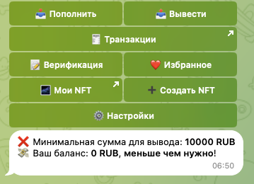 Нужно будет купить монету и через некоторое время продать по такому же сигналу. В результате пользователь получит прибыль на баланс аккаунта. Само собой, никаких покупок НФТ в боте нет. На это указывает, в том числе, тот факт, что вывод с сервиса доступен только в рублях.