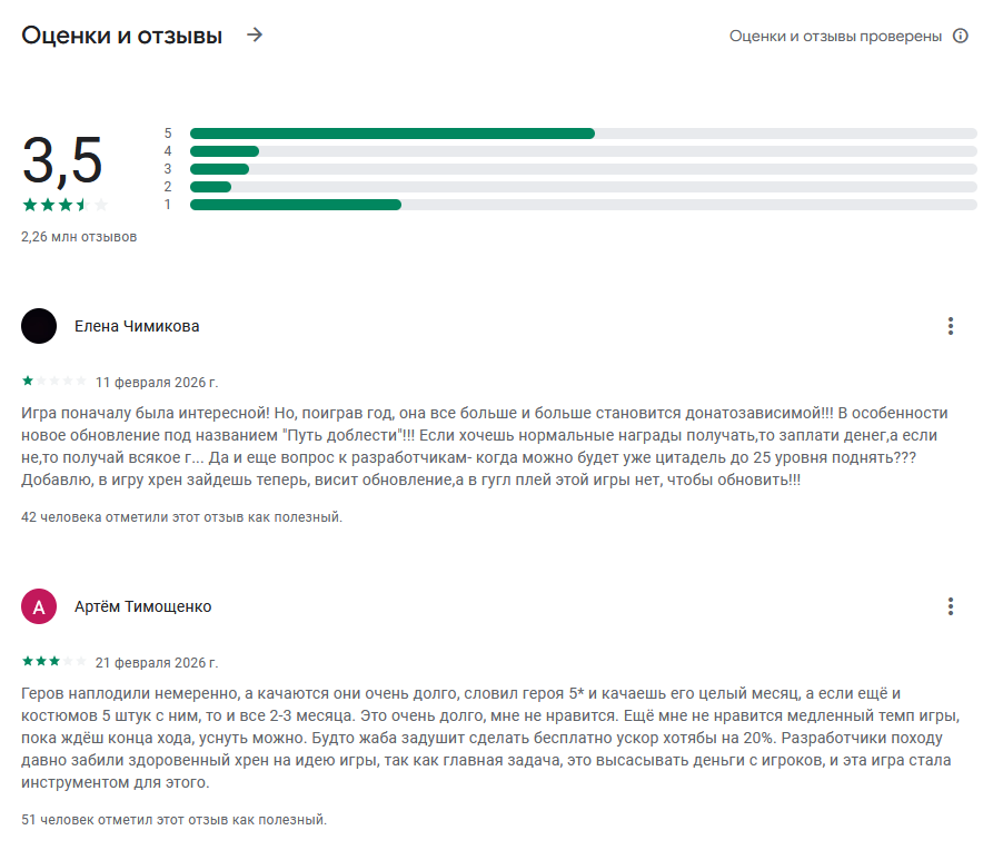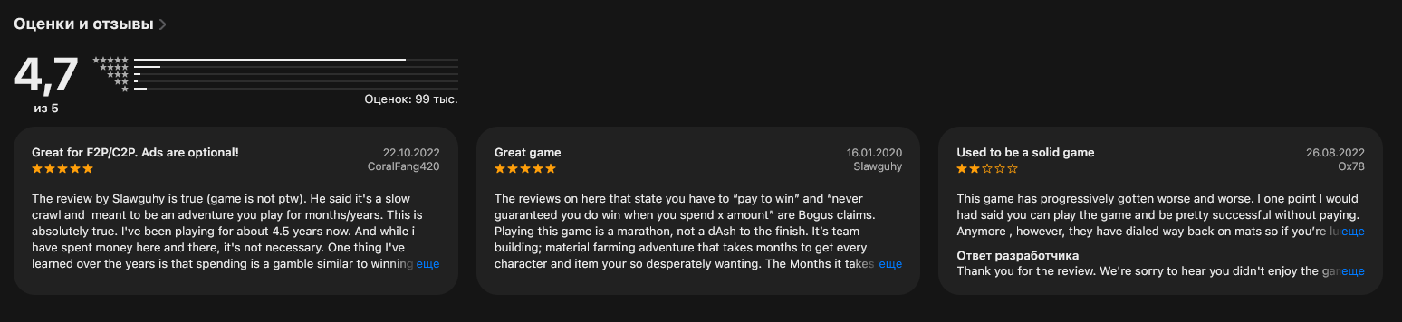 Оценивать отношение к Empires Puzzles будем по отзывам на маркетплейсах. Это основной способ получить запустить игру, соответственно здесь игроки делятся своими мнениями активнее всего: