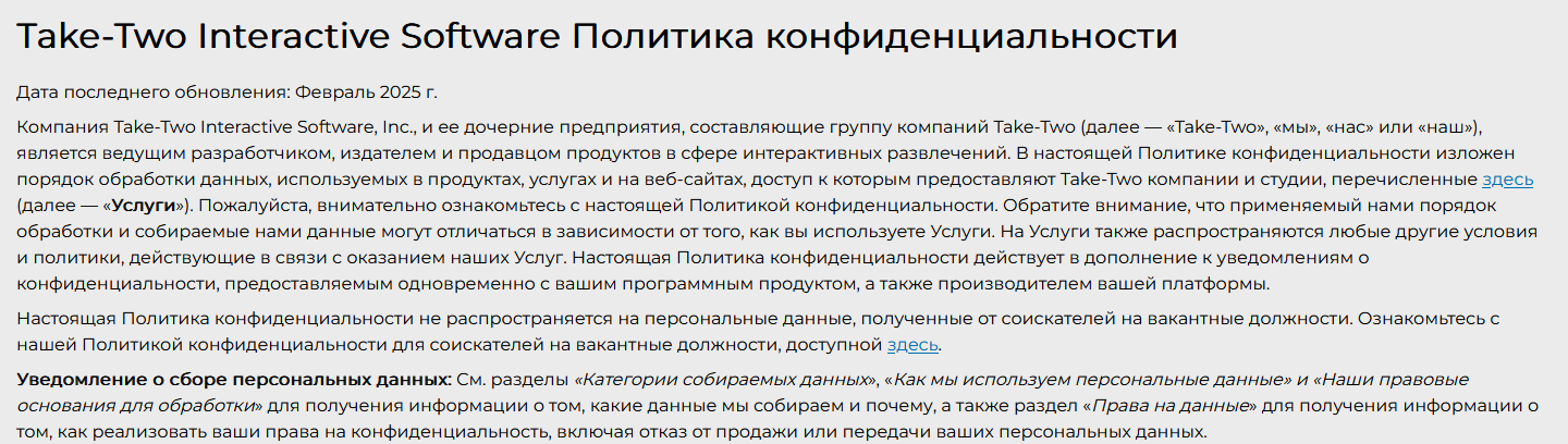 Они достаточно подробные, уникальные и составлены юридически грамотно. Но главное здесь — наличие названия компании, которой принадлежит проект. Это крупный издатель Take-Two, за плечами которого выпуск GTA, It Takes Two, Red Dead Redemption, Mafia и множество других именитых игровых проектов.