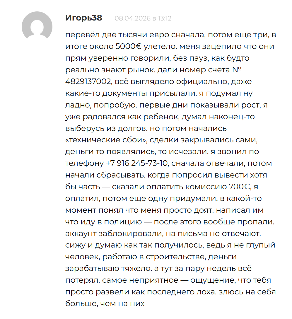 Не хочу сыпать соль на рану, но я прям рад, что решил погуглить, а то потерял бы около 30 тысяч рублей. А что думаете о https://tehnoobzor.com/shikaro-obzor/? Он на этом сайте топ 1, кто-то пробовал с ними работать?