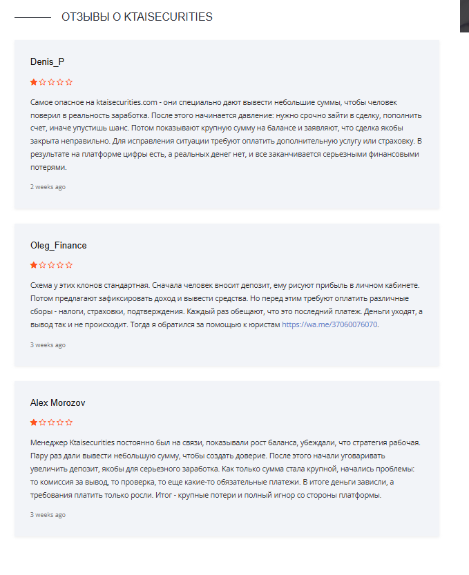 Отзывы о проекте Ktaisecurities в сети только негативные. Пользователи рассказывают, что мошенники работают по стандартной схеме. Пользователей на площадку они заманивают различными способами: через мессенджеры, социальные сети по телефону. Клиенту обещают огромную прибыль. Пользователь вносит деньги и даже видит увеличение баланса в личном кабинете. Однако, как только он пытается вывести средства, ему сообщают о наличии проблем или необходимости оплатить дополнительные взносы. По итогу никто никаких денег не получает. Далее мошенники просто блокируют личный кабинет.