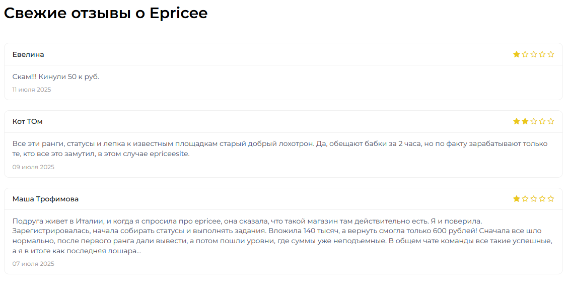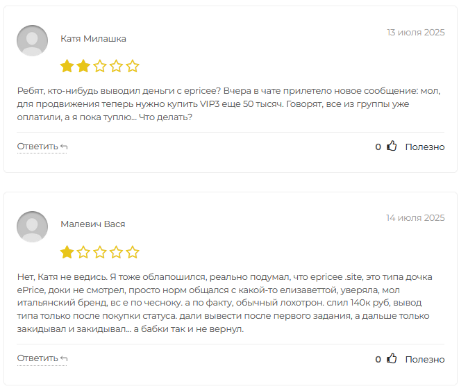 Положительных отзывов о Epricee найдено не было. А в других люди пишут, что это очевидный скам с классической схемой по обратным выкупам товаров. Ее уже далеко не первый год используют для обмана доверчивых пользователей.