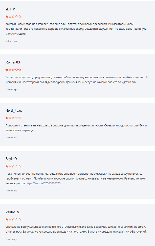 Equity Securities Market Brokers Ltd утверждает, что работает с 2021 года, но домен зарегистрирован только в 2025 году. Отсутствие лицензии и юридической информации делает компанию нелегальной и неподотчетной. Пользователи сообщают о блокировке аккаунтов при попытке вывода средств и игнорировании со стороны поддержки.