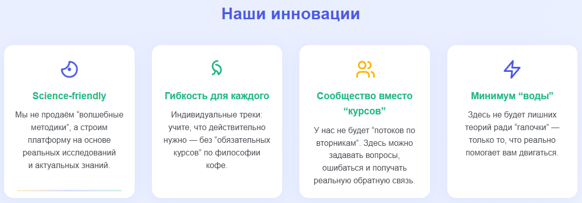 Проект строится на четырех принципах. Опора на научные исследования вместо волшебных методик. Гибкие программы обучения под каждого студента. Сообщество вместо стандартных курсов. Минимум теории и максимум практики в реальных проектах.