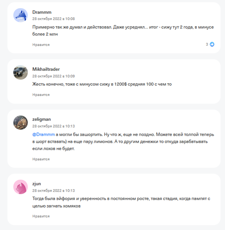 Часть инвесторов говорит, что решили войти в проект, когда он находился на подъеме и доходы были хорошими. Также есть предположения, что рост цены был спровоцирован специально – с целью привлечения большего числа вкладчиков. Сейчас наступил естественный спад, во время которого инвесторы терпят серьезные убытки.