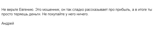 Еще один пользователь утверждает, что Евгений – мошенник. Он призывает не доверять ему и считает, что автор канала и интернет-магазина обманывает его.