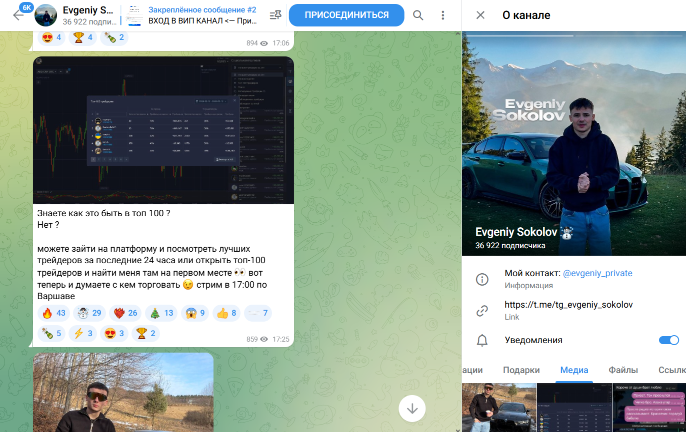 Евгений разместил пост, в котором расписал, что занимается заработком на валютном рынке 2 года. За этот период, как уверяет, смог заработать хорошие средства, и даже приобрел автомобиль. При этом доказательств успехов нет. Целью Телеграм канала, как пишет Евгений Соколов, является показывать торговлю пользователям, а также публично накопить на авто мечты за 80 000 долларов. Для связи парень оставляет ссылку на тг-страницу Evgeniy Private. Смс пользователей принимаются с 9:00 и до 2:00 по будням.