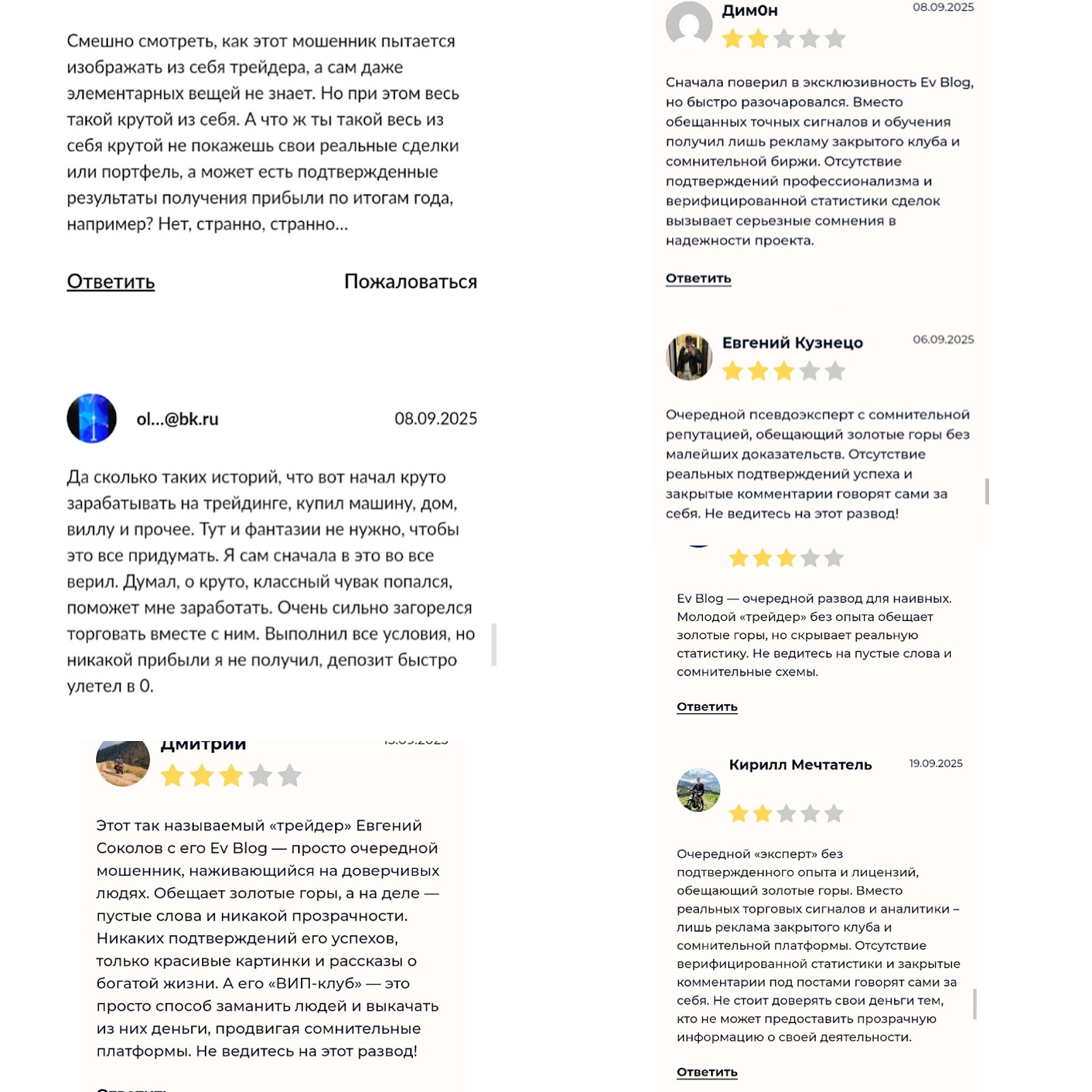 Многие пользователи потеряли средства из-за рекомендаций трейдера. Если вы сотрудничали с Евгением Соколовым, можете оставить отзыв ниже.