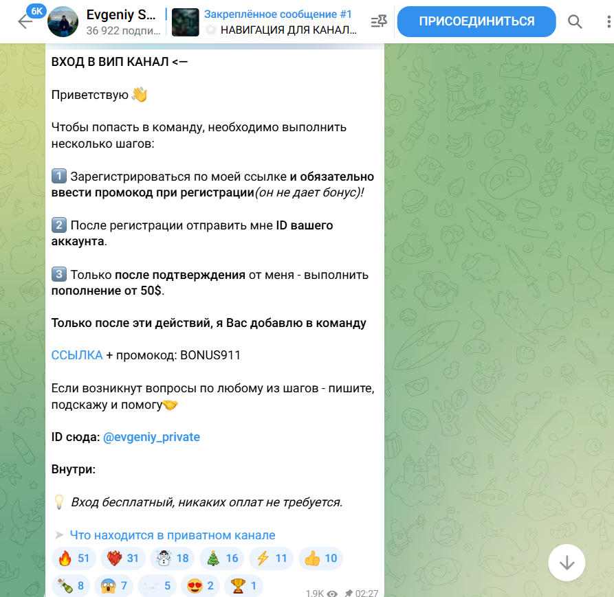 Далее участник будет добавлен в чат, и платить ничего не нужно. Из таких условий очевидно, что Евгений зарабатывает даже на минусовых сделках рефералов. По всем вопросам просить обращаться к нему в лс.