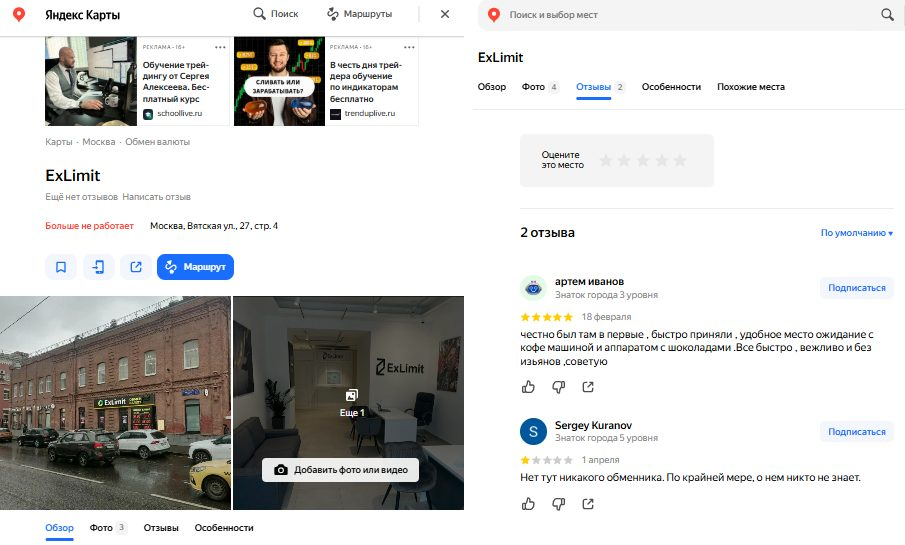 Их даже можно найти на Яндекс картах. Только у них есть метка «Больше не работает», фотографии офиса выглядят как сгенерированные, а при просмотре панорамы улиц нельзя увидеть вывесок, которые показаны на фотографиях.