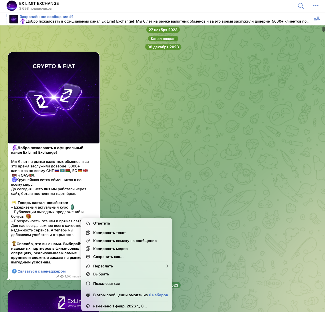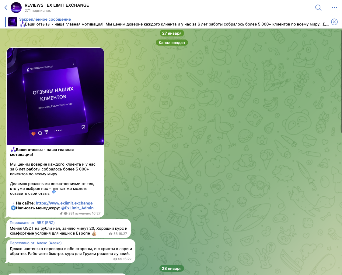 Отдельный канал с отзывами об обменнике тоже начал работать только в конце января 2026 года. При этом отзывы начали размещаться даже раньше, чем был запущен сайт.
