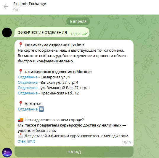 Примечательно, что в Телеграм-боте и на сайте обменника можно найти информацию о физических отделениях проекта.