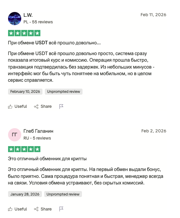 - отзывы, сайт и Телеграм-канал датируются началом февраля 2026 года, авторы заявляют, что обменник работает с 2021 года;