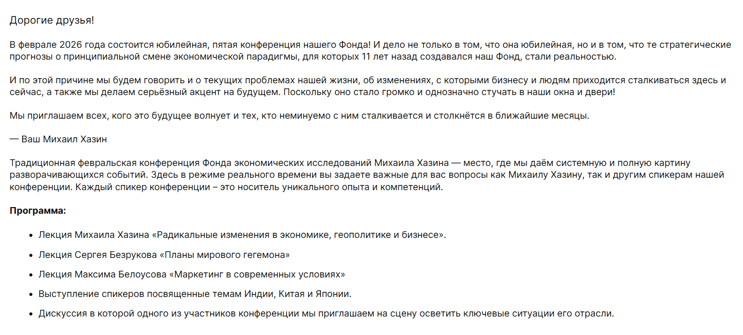 «Ежегодная конференция Фонда Хазина: билеты проданы, а инфа — как всегда, воздух. Платить за пустоту? Спасибо, не надо.»