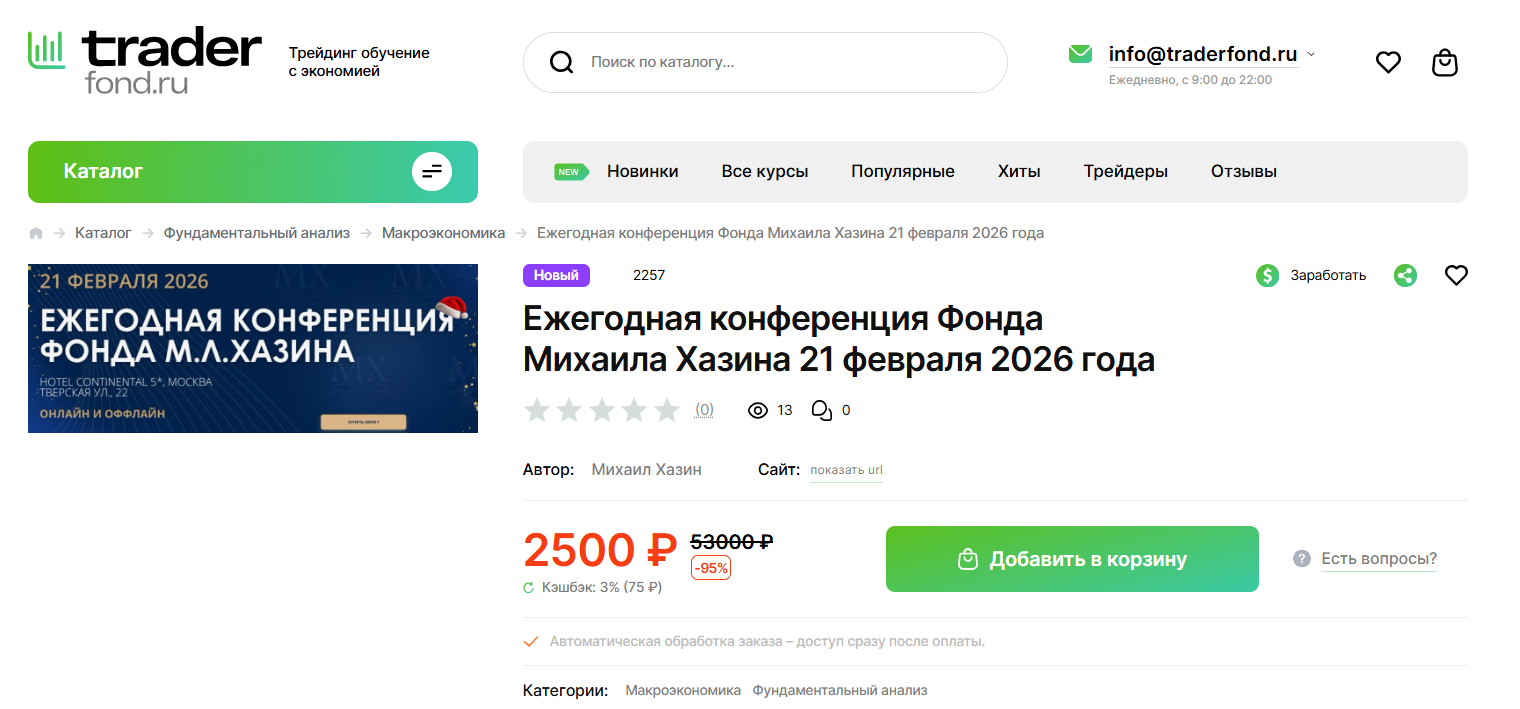 Билеты на мероприятия продаются через сайт Khazin ru. На конференцию 2026 года цены были такие: от 29 000 рублей за лекцию Хазина и до 195 000 за офлайн-участие. После событий можно было купить запись. Но фонд не рекламирует продажу видео с прошлых мероприятий, так как это не главный их продукт.