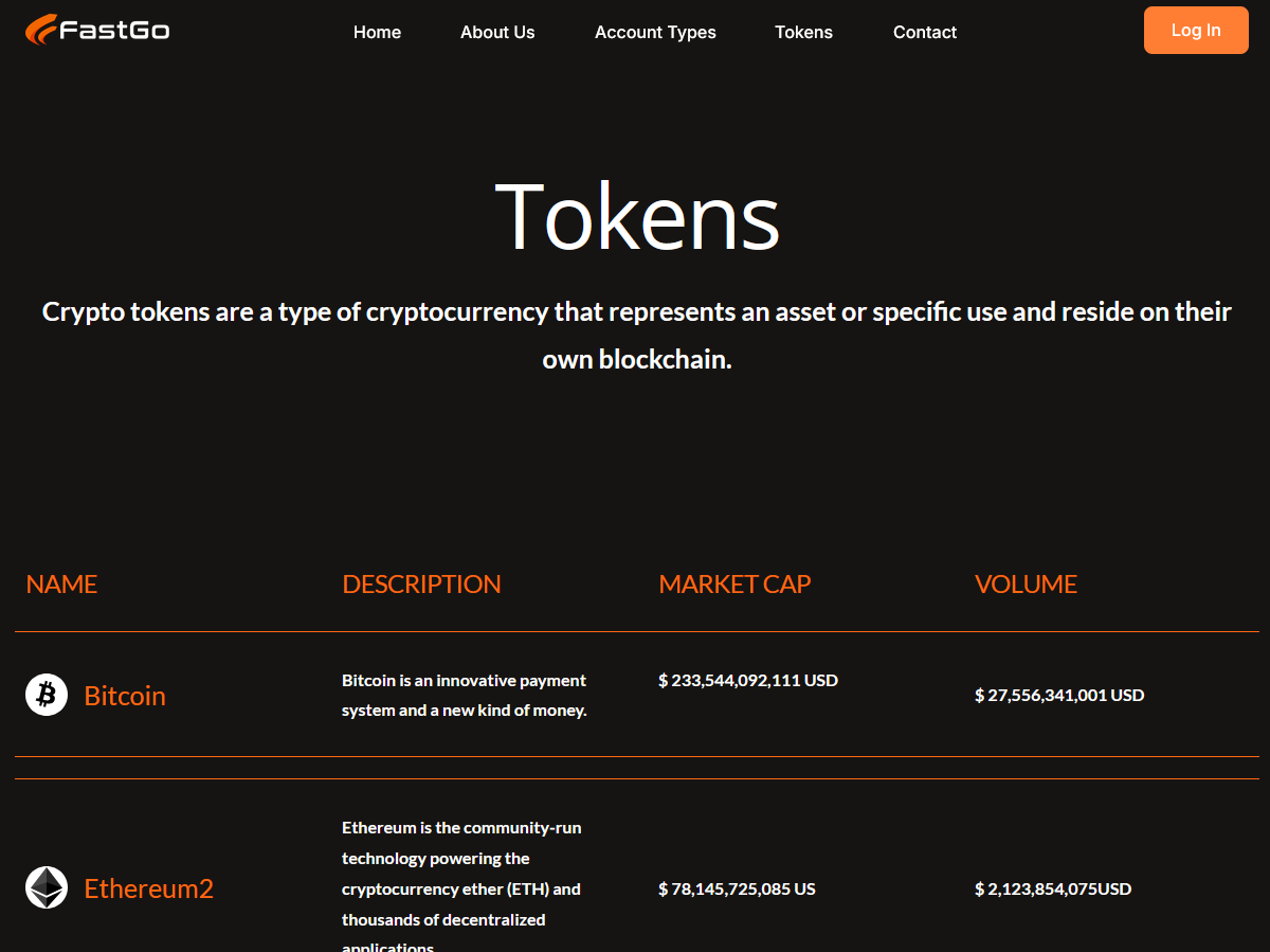 Брокер Fast Go работает только с криптовалютами. В их число входит Bitcoin, Ethereum, Tether, Polkadot, Vetraq, Nuvro, Qelto и Dranix. Этот перечень опубликован на отдельной странице вместе с данными о резервах.
