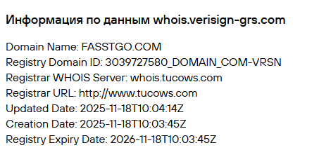 Веб-сайт FasstGo Com работает с ноября 2025 года. Зарегистрирован через канадского регулятора, сведения об администраторе в Whois скрыты настройками конфиденциальности.
