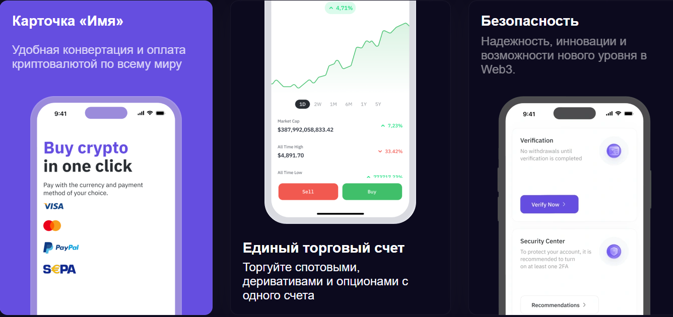 Площадка предлагала покупку, продажу и хранение криптовалют. Заявляли о 300+ активах и работе в 75+ блокчейн-сетях. Доступна спотовая торговля, деривативы и опционы.