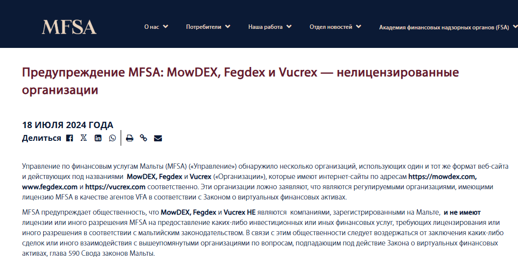 18 июля 2024 года Мальтийский регулятор MFSA выпустил предупреждение. Выяснилось интересное – три площадки используют одинаковый шаблон сайта: MowDEX, Fegdex и Vucrex. Все трое лгали о регулировании MFSA как VFA Agents.