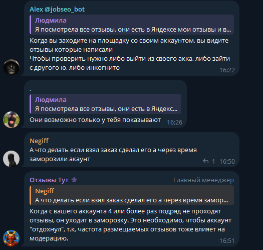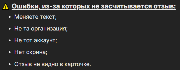 Сервис указывает такие ситуации, при которых они могут не заплатить исполнителю. Первые 4 — типовые ошибки, вообще без проблем. Пятая интереснее. Под «отзыв не видно в карточке» попадают две ситуации: пользователь сделал что-то не так; пользователь сделал все правильно, но накрутка слишком явная, и сомнительные высказывания удалили.